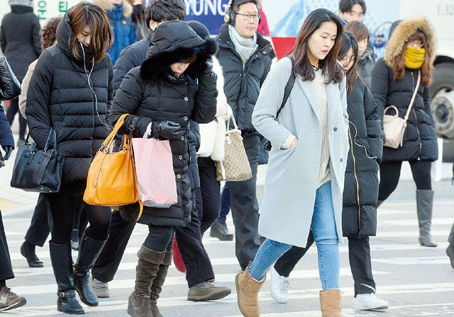 중부와 영남지방에 한파주의보가 내려진 15일 오전 서울 광화문 네거리에서 시민들이 출근하고 있다.