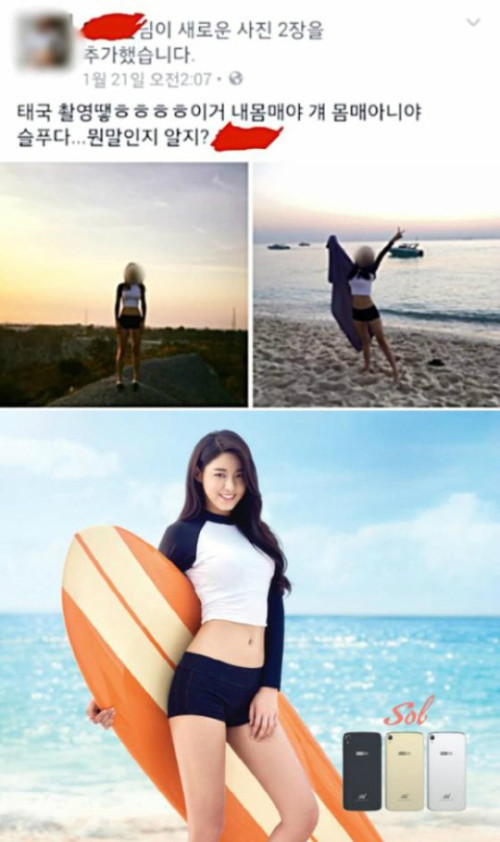 한 여성은 지난 14일 자신의 SNS를 통해 “내 몸매다, 걔 몸매가 아니다. 태국 촬영 때, 이거 슬프다. 뭔말인지 알지?”라는 글을 게재했다. 이는 최근 설현이 출연하고 있는 한 통신사의 단말기 CF에서 나오는 설현의 몸매가 자신의 것이라는 주장인 것. 공개 후 삽시간에 논란의 중심에 서자 이 여성은 글과 사진을 현재 삭제한 상태다.