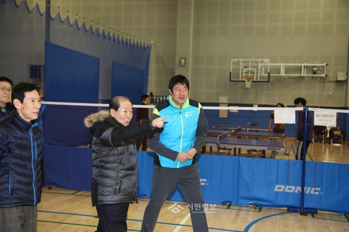 지난 15일 박홍섭 마포구청장(오른쪽에서 두 번째)이 망원동에 위치한 마포구민체육센터를 방문해 '2004 아테네올림픽' 금메달리스트인 요넥스코리아의 하태권 감독(오른쪽)에게 배드민턴 훈련장소를 안내받고 있다.(사진제공=마포구청)