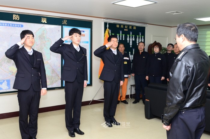 지난 15일 서대문소방서는 서장실에서 신규 소방공무원 3명 등 간부 20명이 참석한 가운데 '신규 소방관 임용식'을 열었다. 사진은 신규 소방관들이 장현태 서장에게 경례를 하는 모습.(사진제공=서대문소방서)