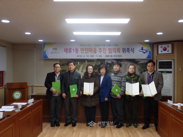 16일 경기 수원시 권선구 세류1동은 동주민센터에서 안전마을 추진협의회 위원 위촉식을 열었다. 사진은 행사에 참석한 관계자들이 기념촬영을 하는 모습.(사진제공=권선구청)