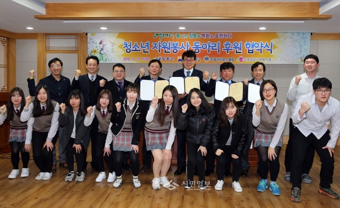지난 15일 전남 장흥군에 위치한 장흥라이온스클럽과 종합사회복지관은 군청 상황실에서 장흥고 청소년 자원봉사 동아리 후원 협약식을 개최했다. 사진은 김성 군수(뒷줄 오른쪽에서 네 번째)와 관계자들이 기념촬영을 하는 모습.(사진제공=장흥군청)