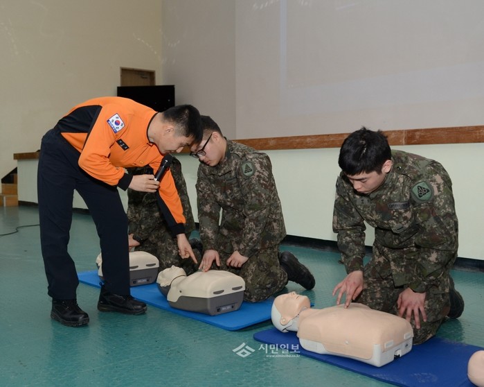 지난 15일 서울 광진소방서는 경기 남양주 금곡예비군 훈련장에서 복무하는 군인들을 대상으로 심폐소생술 및 응급처치 교육을 실시했다. 사진은 교육에 참가한 군인들이 심폐소생술 실습을 하는 모습.(사진제공=광진소방서)