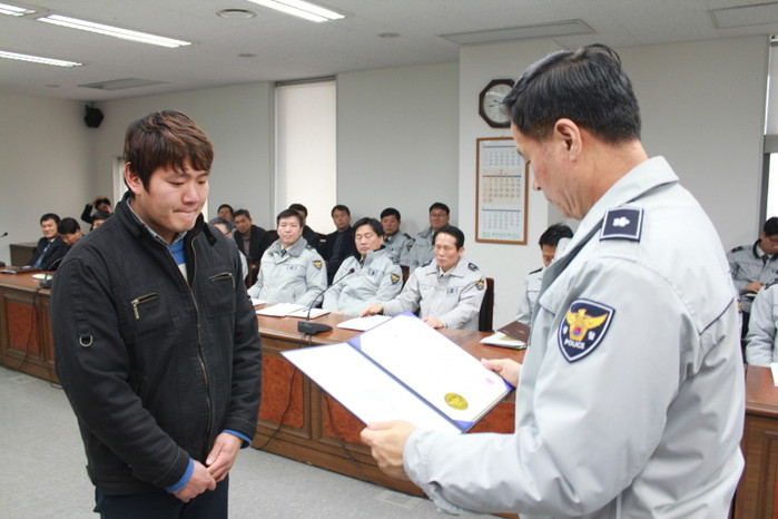지난 15일 성남 분당경찰서는 최근 탄천에 빠진 노인을 구한 뒤 사라진 김윤성 씨(35)를 소셜네트워크서비스(SNS) 제보를 통해 찾아낸 후 감사장을 수여했다. 사진은 진정무 서장이 김 씨에게 감사장을 수여하는 모습.(사진제공=분당경찰서)