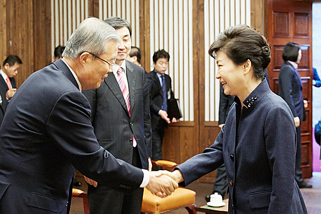 박근혜 대통령이 16일 오전 서울 여의도 국회 의장 접견실에서 국정에 관한 국회 연설 전 더불어민주당 김종인 비상대책위 대표를 만나 인사를 나누고 있다.