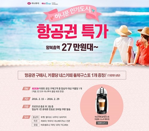 또한 이벤트 운임 구매고객 중 탑승자 대상으로 15만원 상당에 네스카페돌체구스토 피콜로 스노우 화이트를 커플당 1개 증정 등 이벤트도 풍성하다.
