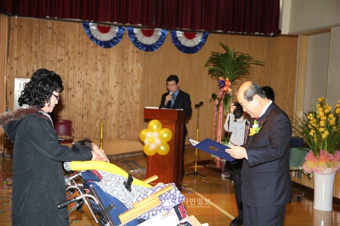 지난 16일 오전 박홍섭 마포구청장(오른쪽)이 지체장애 특수교육기관인 마포구 중동에 위치한 '한국우진학교 졸업식'에 참석해 한 졸업생에게 표창장을 수여하고 있다.(사진제공=마포구청)