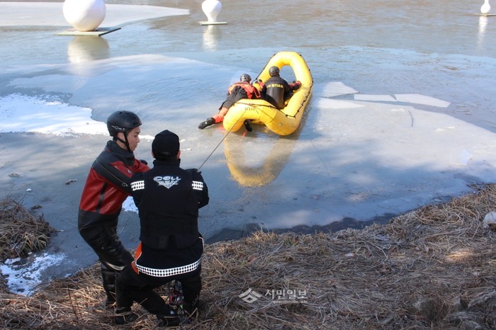 17일 경기 이천소방서는 119구조대원 및 장호원119안전센터 직원 20명을 대상으로 '해빙기 익수사고 및 빙상사고 대비 수난구조훈련'을 실시했다. 사진은 구조대원들이 빙상겸용 보트를 이용한 구조기법을 수행하는 모습.(사진제공=이천경찰서)