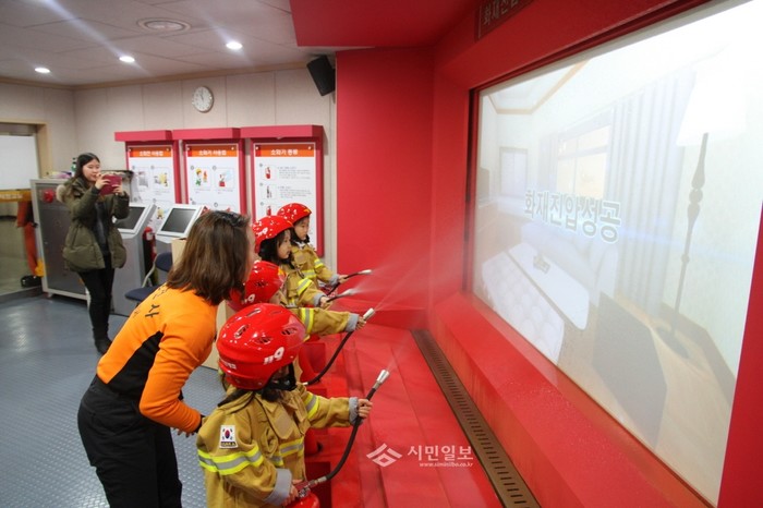 지난 16일 오전 10시 서울 동작소방서는 소방안전체험교실에서 대천어린이집 원아 30여명에게 소방안전교육을 실시했다. 사진은 어린이들이 소화기 사용 실습을 하는 모습.(사진제공=동작소방서)