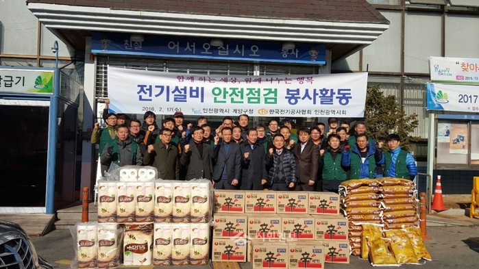 17일 한국전기공사협회 인천광역시회는 ‘계양구 행복나눔 연합모금’에 동참해 성품 백미 350kg 및 라면, 휴지, 전기자재(총 환가액 250만원) 등을 계양2동 저소득층 35가구에 전달했다. 사진은 관계자들이 기념촬영을 하는 모습.(사진제공=계양구청)