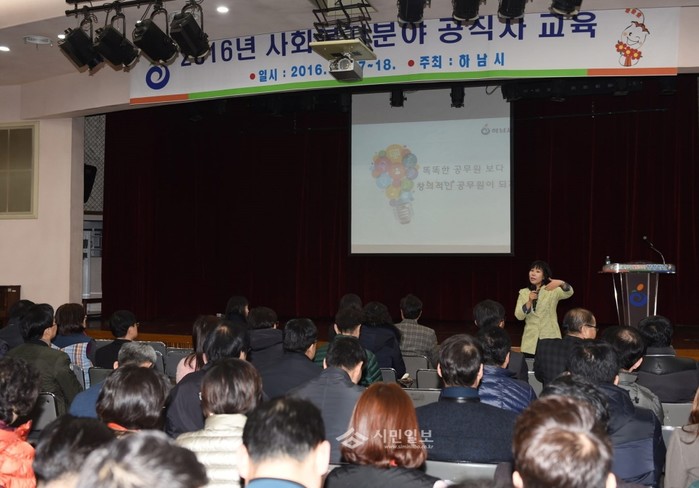 경기 하남시는 17일 시청 대회의실에서 300여명의 공무원이 참석한 가운데 사회복지분야 교육을 실시했다. 사진은 관계자가 사회복지분야 교육을 진행 하는 모습.(사진제공=하남시청)
