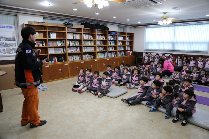 17일 경기 여주소방서는 소방서를 방문한 푸른유치원 90여명을 대상으로 소·소·심(소화기·소화전·심폐소생술) 소방안전체험교실을 진행했다. 사진은 소방서 관계자가 어린이들에게 이론 교육을 하는 모습.(사진제공=여주소방서)