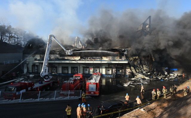 17일 오후 2시 5분께 경기도 이천시의 한 물류창고에서 원인미상의 화재가 발생, 소방대원들이 화재진압을 하고 있다.