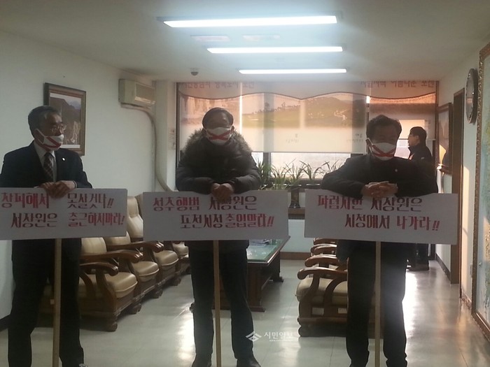 경기도 포천시의회 더불어 민주당 소속 (사진 오른쪽부터)이형직, 류재빈, 이원석 의원이 18일 시장 집무실 앞에서 서장원 시장의 자진 사퇴를 요구하는 피켓 시위를 하고 있다.