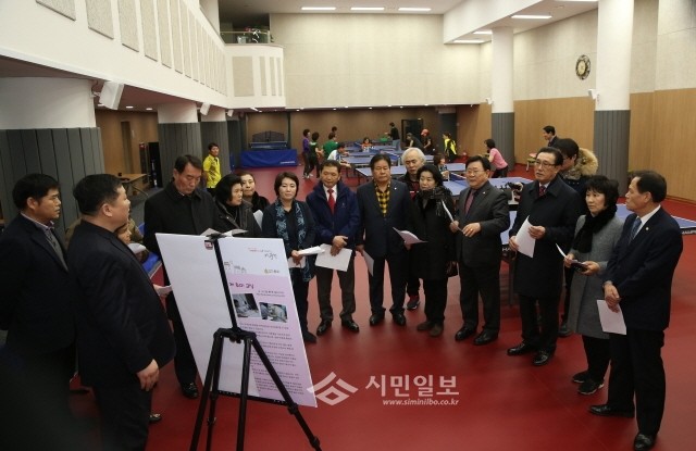 | ▲ ‘종로구립 탁구 전용구장’을 방문한 의원들이 관계자로부터 향후 운영 계획에 대해 보고를 받고 있다.(사진제공=종로구의회) | ||