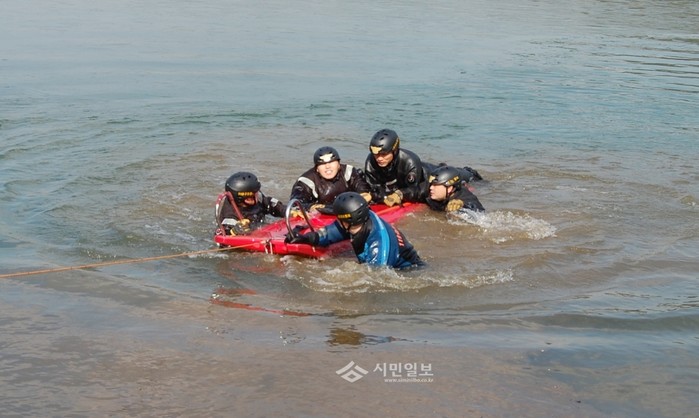지난 17일 경기 오산소방서는 서랑동저수지에서 해빙기 대비 수난인명구조훈련을 실시했다. 사진은 저수지에 요구조자가 빠져 있는 상황을 가상해 119구조대 관계자들이 소방구조보트를 활용해 인명구조훈련을 하는 모습.(사진제공=오산소방서)