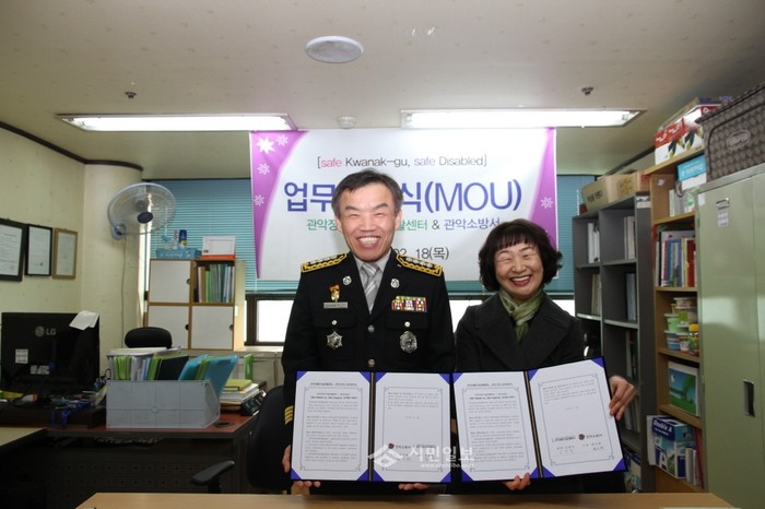 최근 서울 관악소방서는 관악장애인자립생활센터와 장애인에 관련된 생활안전 정보를 제공하는 데 상호간 협력할 것을 주요내용으로 한 업무협약을 체결했다. 사진은 황인환 서장(왼쪽)이 기념촬영을 하는 모습.(사진제공=관악소방서)