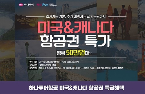 하나투어항공 미국&캐나다 항공권 이벤트는 오는 2월 22일 오전 10시부터 2월 23일까지 단 2일간 진행되며 자세한 내용은 하나투어닷컴 관련 기획전(http://bit.ly/1Q2hExX)을 통해 확인 가능하다.