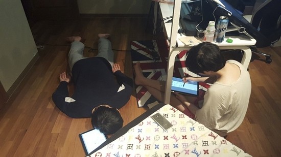 사진 속에서 한 남자는 바닥에 엎드려 있고 다른 한 남자는 태블릿 PC로 무언가를 하고 있다.