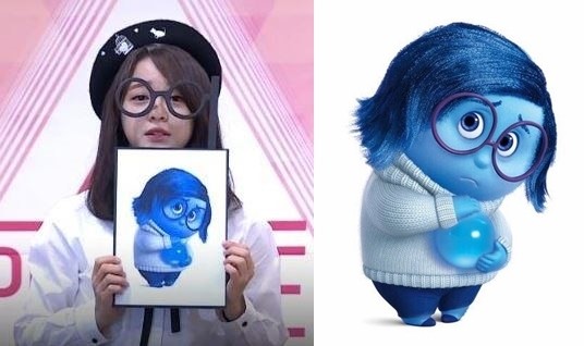 비교된 두 사진 속 그녀는 슬픔이와 비슷한 안경을 쓴채 시무룩한 표정을 짓고 있다. 안경 사이로 드러난 그녀의 귀여운 외모가 뜨거운 반응을 불러모았다.