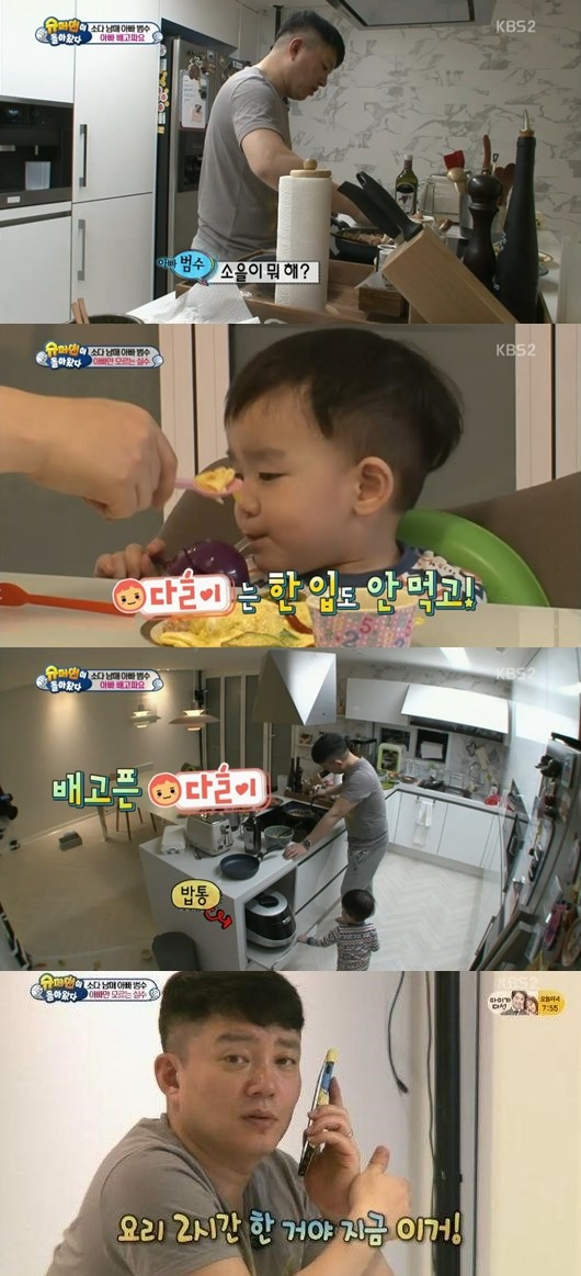 이범수는 이날 방송에서 소을-다을 남매를 위해 식사 준비를 했다. 그러나 요리가 익숙치 않은 이범수는 아이들을 위해서 쉽지 않은 요리에도 도전하는 고행(?)의 길에 올랐다.