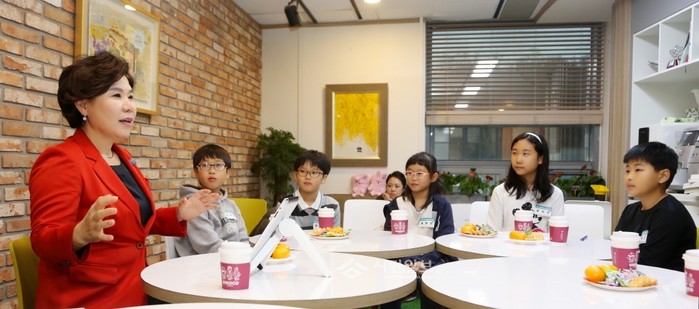 | ▲ 서래초등학교 4학년 5반 아이들과의 간담회에서 아이들에게 조은희 구청장(왼쪽)이 교육지원 방법 등에 대해 이야기하고 있다. | ||