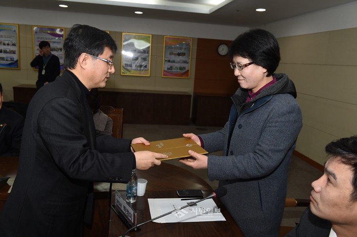 노원구는 최근 구청 5층 기획상황실에서 '노원구 구민감사관 위촉장 수여식'을 진행했다. 사진은 행사에 참석한 김성환 구청장(왼쪽)이 관계자에게 위촉장을 수여하는 모습.(사진제공=노원구청)