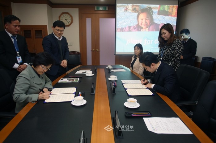지난 19일 서울 강남구는 구청에서 트리플래닛과 ‘양재천에 무궁화 동산 조성을 위한 협약’을 체결했다. 사진은 신연희 구청장(왼쪽)이 김형수 트리플래닛 대표와 협약을 체결하는 모습.(사진제공=강남구청)