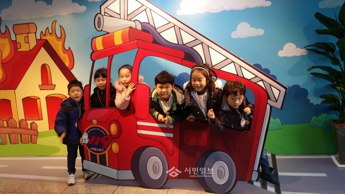 지난 19일 서울 서대문소방서는 햇살어린이집 원아를 대상으로 ‘어린이안전교육’을 실시했다. 사진은 교육에 참석한 어린이들이 기념촬영을 하는 모습.(사진제공=서대문소방서)
