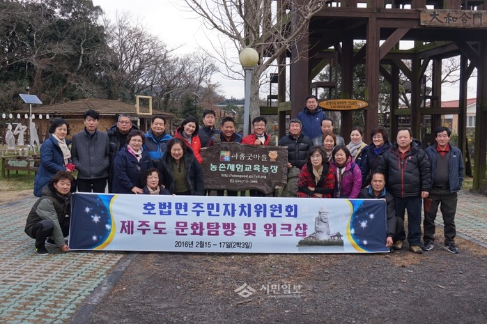 최근 경기 이천시 호법면 주민자치위원회에서는 제주도에서 주민자치위원 직무교육 및 문화탐방을 목적으로 한 ‘2016년 주민자치위원 워크샵’을 개최했다. 사진은 행사에 참여한 관계자들이 기념촬영을 하는 모습.(사진제공=이천시청)