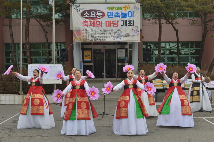 최근 경기 동두천시는 소요동 주민센터 앞마당에서 '2016년 정월대보름맞이 민속놀이 한마당 축제'를 진행했다. 사진은 행사 참가자들이 축하공연을 하고 있는 모습.(사진제공=동두천시청)