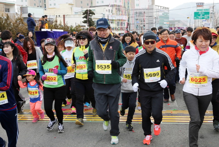 지난 21일 전남 장흥군에 위치한 탐진강변 체육공원에서 4000명이 참석한 가운데 '제11회 정남진 장흥 마라톤대회'가 진행됐다. 사진은 행사에 참가한 김성 군수(가운데)와 이봉주 선수를 비롯한 관계자들이 달리는 모습.(사진제공=장흥군청)