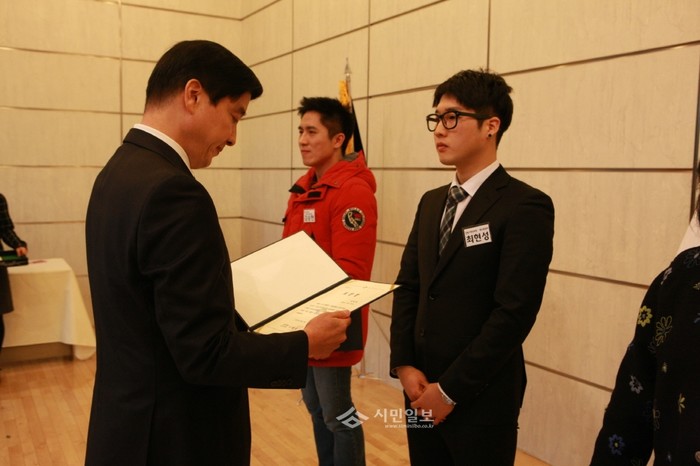 이해식 강동구청장(왼쪽)은 최근 열린 '서울시 동부기술교육원 수료식'에 참석해 우수 수료생에게 표창장을 수여하고 새출발을 축하했다.(사진제공=강동구청)
