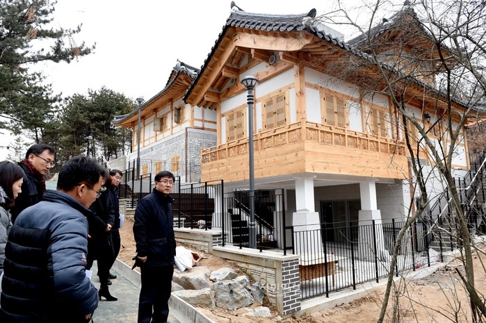 김성환 노원구청장(오른쪽)이 지난 22일 오전 10시 상계동 산118-4 '수락한옥어린이집' 공사현장을 방문해 관계자들과 함께 시설을 점검하고 있다.(사진제공=노원구청)
