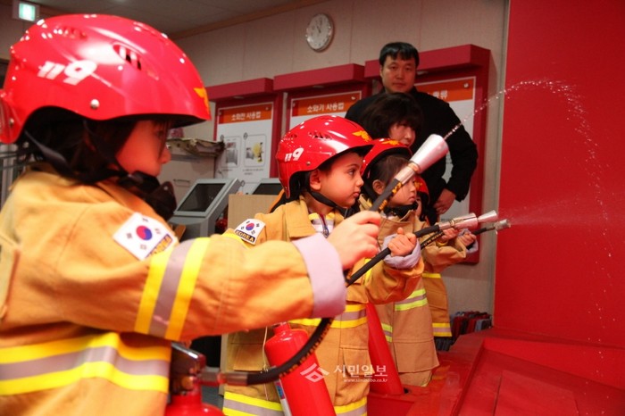 지난 22일 서울 동작소방서는 소방서 3층 소방안전체험교실에서 평강유치원 원아 40여명에게 소방안전교육을 실시했다. 사진은 어린이들이 소방복을 입고 물 소화기를 뿌리며 체험을 진행하는 모습.(사진제공=동작소방서)