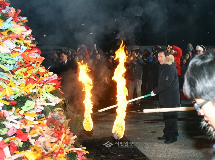 지난 21일 임춘대 서울 송파구의회 의장은 서울놀이마당에서 열린 ‘2016 정월대보름 행사’에 참석했다. 사진은 임 의장이 정월대보름 달집을 태우며 구민행복을 기원하는 모습.(사진제공=송파구의회)