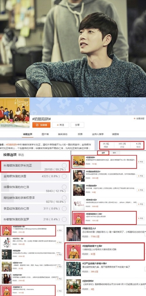 특히 그의 인기는 투표를 통해 뚜렷하게 드러났다. 웨이보에서 진행되고 있는 ‘치인트’ 속 인기 캐릭터 투표에선 박해진의 유정이 59.2%로 압도적인 1위에 등극했기 때문이다.