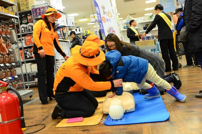 지난 23일 영등포소방서는 지역내 이마트 등 대형할인마트에서 '기초소방시설 1일 판매도우미 행사'를 실시했다. 사진은 매장 방문객들이 소방관들과 심폐소생술 체험을 진행하고 있는 모습.(사진제공=영등포소방서)