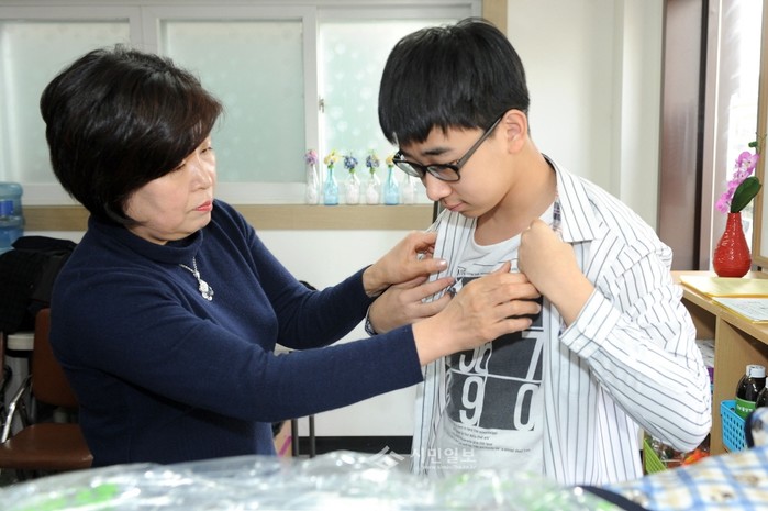 서울 송파구는 학부모들의 경제적 부담을 덜고 자원 재활용과 나눔의 의미를 확산하기 위해 ‘나눔교복매장’을 상설 운영하고 있다. 사진은 지난 23일 나눔교복매장을 방문한 한 모자가 교복을 고르는 모습.(사진제공=송파구청)