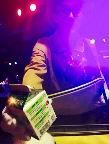 사진 속 첸은 카메라 쪽으로 불쑥 우유를 내밀며 완벽한 야쿠르트 아줌마로 빙의 했다.