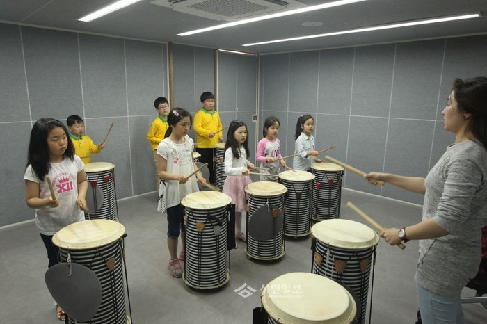 | ▲ 서울 구로구 궁동에 위치한 구로 청소년 문화의 집에서 학생들이 난타 수업을 듣고 있다. 구로 청소년 문화의 집은 지하 1층~지상 3층, 연면적 1181㎡ 규모로 2015년 5월께 개관했다. | ||
