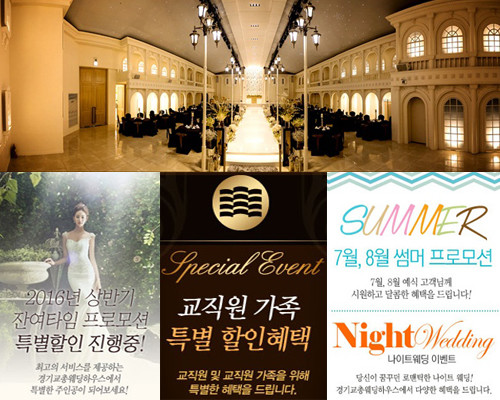 현재 수원웨딩홀을 알아보는 예비신랑, 신부의 예산걱정을 덜어주기 위해 경기교총웨딩하우스에서는 2016년 상반기 잔여타임 프로모션 특별할인, 7~8월 썸머 프로모션, 나이트웨딩 이벤트 등을 진행해 합리적인 가격에 예식장을 이용해볼 수 있도록 운영 중이다.