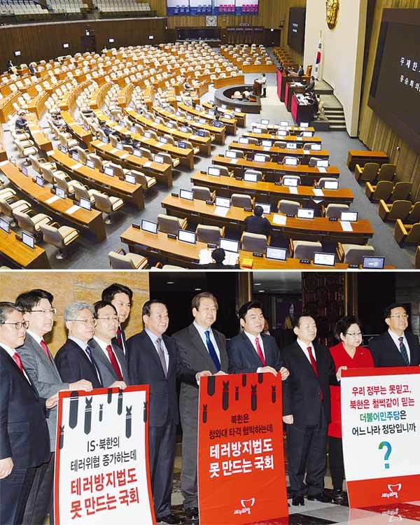 더불어민주당 유승희 의원이 25일 서울 여의도 국회 본회의장에서 테러방지법의 본회의 의결을 막기 위한 무제한 토론을 이어가고 있다(위). 같은 날 오전 서울 여의도 국회 로텐더홀에서 새누리당 김무성 대표, 원유철 원내대표, 서청원 최고위원등 당 지도부와 의원들이 무제한토론으로 국회를 마비시키는 야당을 규탄하는 피켓시위를 하고 있다.