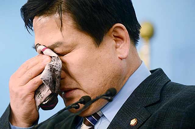 더불어민주당 홍의락 의원이 25일 당 공천관리위원회의 컷오프 결정에 반발 전격 탈당했다. 사진은 홍 의원이 이날 서울 여의도 국회 정론관에서 기자회견을 열고 탈당을 선언하며 눈물을 닦고 있다.