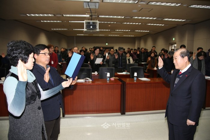 지난 25일 마포구는 구청 4층 시청각실에서 '2016 공동주택지원사업 설명회 및 맑은아파트 만들기 다짐식'을 개최했다. 사진은 박홍섭 구청장(오른쪽)이 참석자 대표들과 선서를 하고 있는 모습.(사진제공=마포구청)