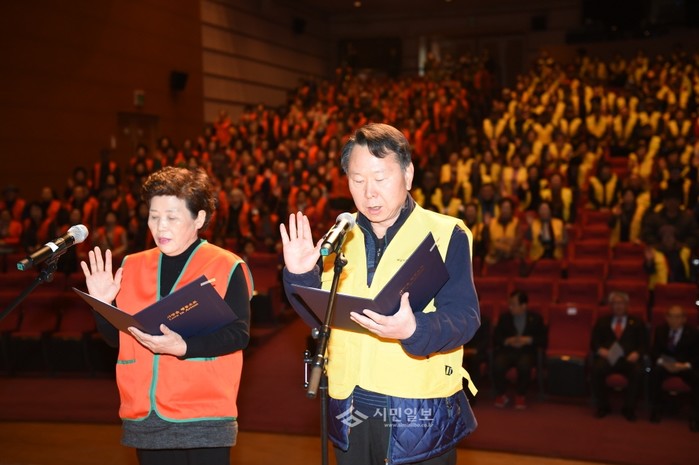 지난 25일 경기 하남시는 하남문화예술회관 검단홀에서 노인들에게 사회참여 기회를 제공하는 사업인 ‘2016 노인일자리 사회활동지원사업’의 발대식을 개최했다. 사진은 관계자들이 결의문을 낭독하는 모습.(사진제공=하남시청)