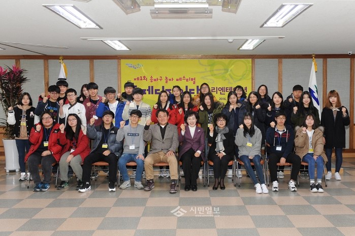 최근 서울 송파구는 ‘제1회 놀페디자인단 오리엔테이션’을 개최해 아동·청소년 100명을 놀페디자인단으로 위촉했다. 사진은 행사에 참석한 박춘희 구청장(앞줄 왼쪽에서 여섯 번째)과 관계자들이 기념촬영을 하는 모습.(사진제공=송파구청)