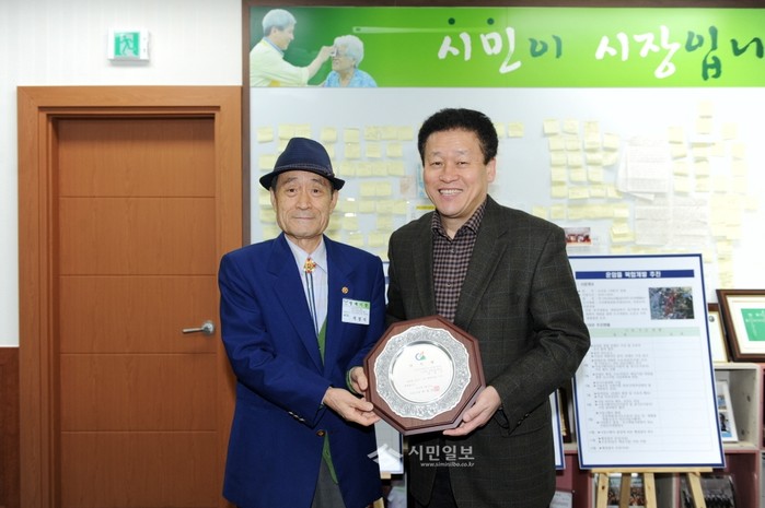 지난 25일 경기 오산시는 민선6기 제16대 ‘1일 명예시장’으로 오산시 운암로 45에 거주하는 석경식(79)씨를 위촉했다. 사진은 유영봉 부시장(오른쪽)이 석씨와 기념촬영을 하는 모습.(사진제공=오산시청)