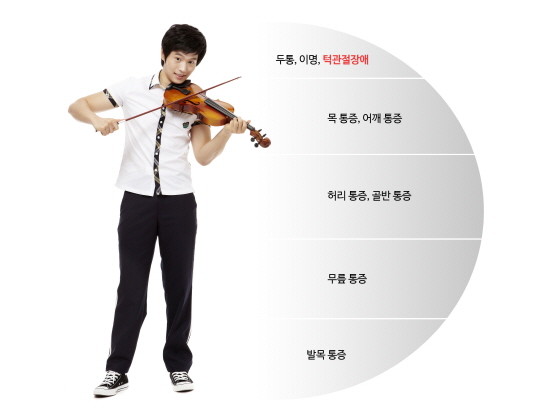 바이올린이나 비올라, 첼로 등 현악기 연주자들과 가야금, 거문고, 해금, 아쟁 등을 연주하는 연주자·전공 학생들에게 가장 잘 나타나는 직업병이 바로 턱관절 장애. 사례의 박 군이 겪고 있는 것과 같은 증상들이 나타난다.
