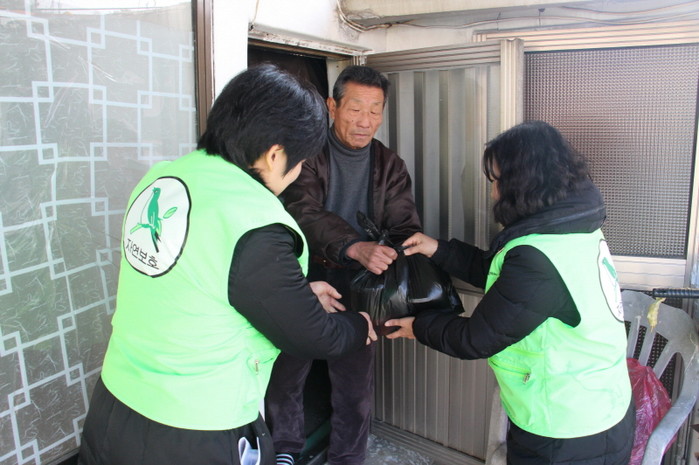 지난 25일 경북 구미시 자연보호비산동협의회는 회원 10여명이 모여 2013년부터 매달 계속사업으로 실시하고 있는 지역내 홀몸노인들을 위한 반찬봉사활동을 전개했다. 사진은 관계자들이 노인에게 반찬을 전달하는 모습.(사진제공=구미시청)